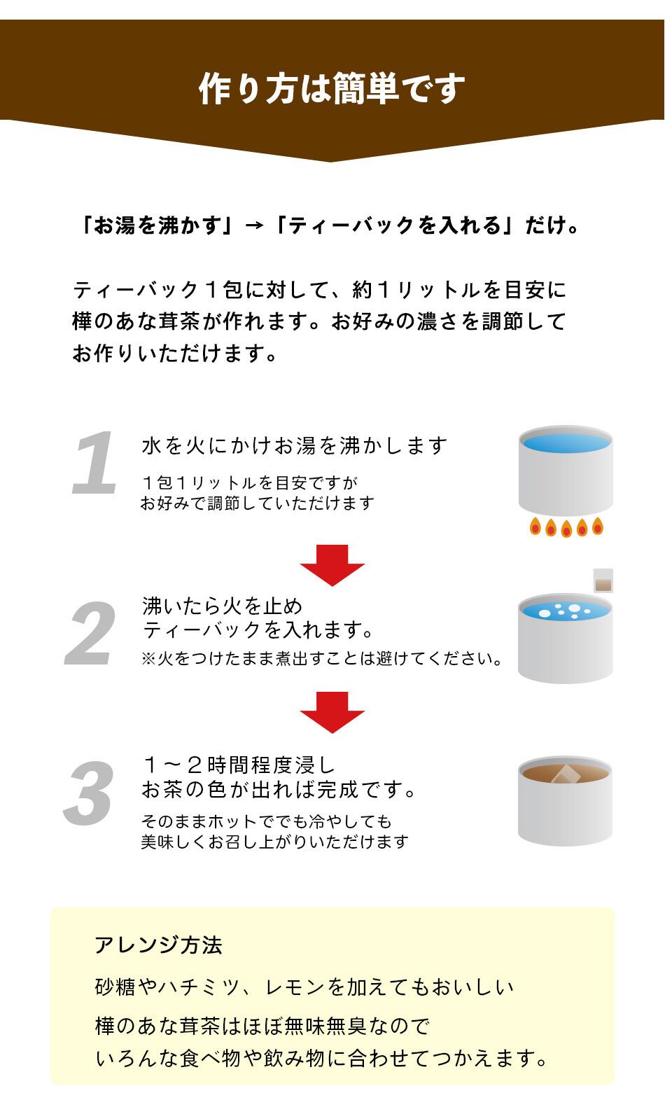 ペットボトルにすると、生産時の高熱処理により素材の成分が失われる可能性があり、また品質を安定させるための添加物を使用しなければならず、天然素材と無添加の品質を保つためティーバックのみでの販売を行っております。素材に防腐剤や着色料を一切使用せず、ティーバッグは、現在問題なっている環境ホルモン(外因性内分泌撹乱化学物質)に該当するものも一切使用せず塩素系漂白剤も使用していないものを使用しています。